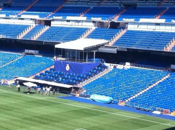 Comme nous vous l'indiquions un peu plus tôt ce vendredi, Gareth Bale (24 ans, 33 matchs et 21 buts en Premier League en 2012-13) pourrait officiellement quitter Tottenham pour rejoindre le Real Madrid ce week-end. Le milieu de terrain gallois pourrait même être présenté par les Merengue demain samedi. Sur cette photo publiée sur Twitter par un journaliste du quotidien As, on peut voir que le stade Santiago-Bernabeu est déjà prêt pour la présentation de la nouvelle star madrilène...