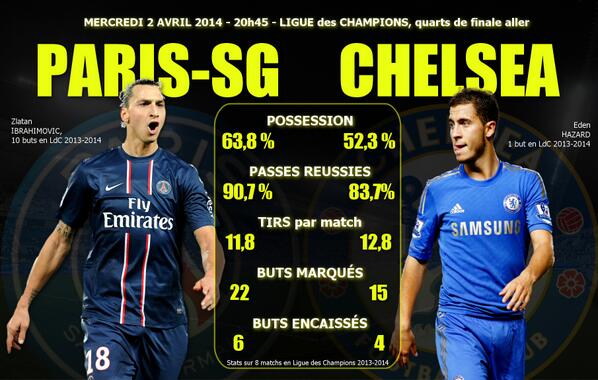 Paris Saint-Germain - Chelsea, c'est une bataille de stars (Ibrahimovic, Thiago Silva, Thiago Motta, Cavani d'un côté, Hazard, Torres, Oscar, Lampard de l'autre) mais aussi une bataille de chiffres. Et sur les 8 matchs de Ligue des Champions disputés cette saison par les deux équipes, ceux-ci sont légèrement en faveur des champions de France.