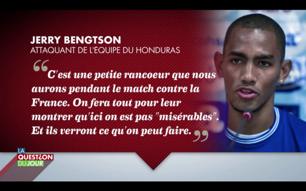 Face à la France dimanche (21h), le Honduras sera très motivé. L'équipe de la zone CONCACAF n'a pas apprécié un documentaire diffusé par Canal+ sur le football hondurien, s'intitulant "les Misérables". L'attaquant du Honduras Jerry Bengtson est maintenant prêt à se payer les Bleus.