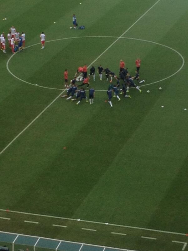 A 30 minutes du coup d'envoi de Suisse-France (21h), les joueurs des deux équipes s'échauffent sur la pelouse de l'Arena Fonte Nova. Avec une température de 26°C, les Bleus ont laissé les sweats au vestiaire. A noter que Paul Pogba, qui s'était beaucoup exprimé avant le rencontre face au Honduras, est resté plus en retrait ce soir, le Turinois débutant ce deuxième match du Mondial sur le banc.