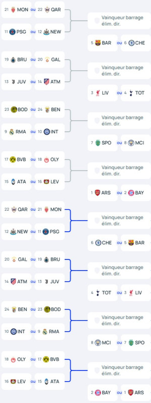 En plus du Paris Saint-Germain et de l'AS Monaco (voir la brève d'hier à 23h43), il y a de belles équipes en barrages de Ligue des Champions cette année. Le Real Madrid et l'Inter Milan, respectivement 9e et 10e, devront notamment s'y frotter. L'un affrontera Bodø/Glimt, l'autre Benfica. Un tirage au sort déterminera ces rencontres. Voici tous les barrages potentiels.